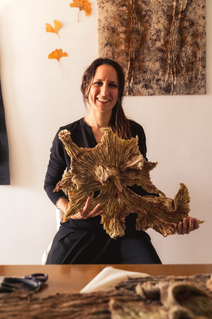 natura. Il suo lavoro si distingue per l’uso esclusivo di fibre e pigmenti naturali, accogliendo
