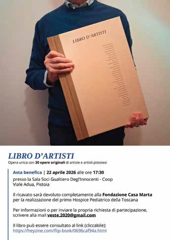 Il LIBRO D’ARTISTI sarà messo all’asta e l’intero ricavato sarà devoluto alla Fondazione Casa Marta di Firenze per la realizzazione e la gestione del primo Hospice Pediatrico della Toscana. L’asta del libro si terrà il 22 aprile alle ore 17,30 presso la Sala Soci “Gualtiero degli Innocenti” di Unicoop in viale Adua, Pistoia.