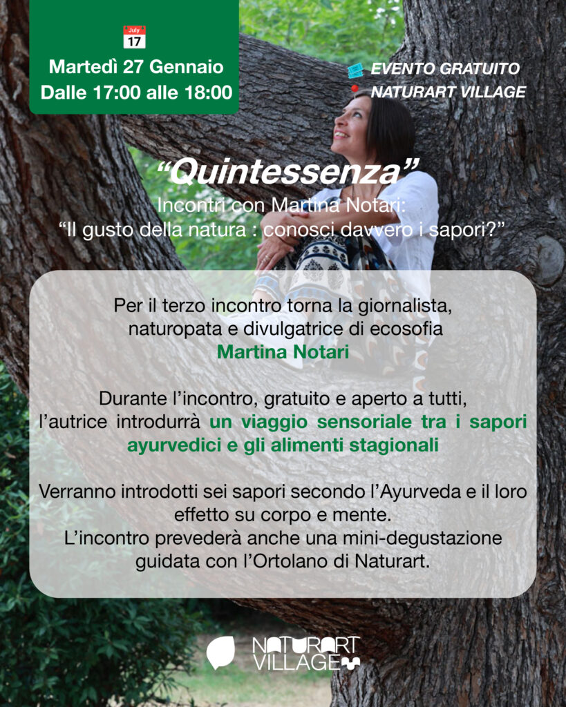 Incontro con Martina Notari per un’esperienza sensoriale che unisce gusto e benessere. Un percorso tra sapori ayurvedici, alimenti stagionali e una mini-degustazione guidata insieme all’Ortolano di Naturart.