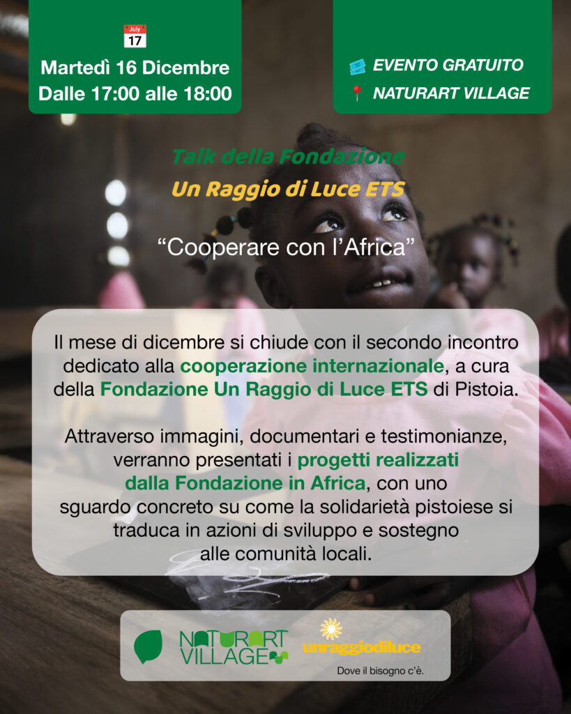 Il ciclo di eventi si conclude con un incontro dedicato alla cooperazione internazionale, a cura di Fondazione Un Raggio di Luce ETS, storica realtà pistoiese che da anni opera in tutto il mondo al fianco delle comunità più vulnerabili.