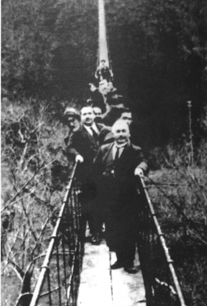 Iniziato nel 1920, con progetto ed esecuzione fatti a vera regola d’arte da risorse interne o comunque locali, il ponte “delle Ferriere” è concluso nel giugno del 1923 e lanciato sulla gola, esile come un ponte tibetano, e sempre ondeggiante, per il vento ma anche per il cauto avanzare degli operai in fila indiana, le mani serrate sui cavi, incerti, immaginiamo, tra il timore di cadere e il sollievo per la stradaccia risparmiata.