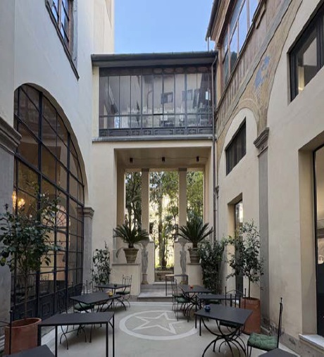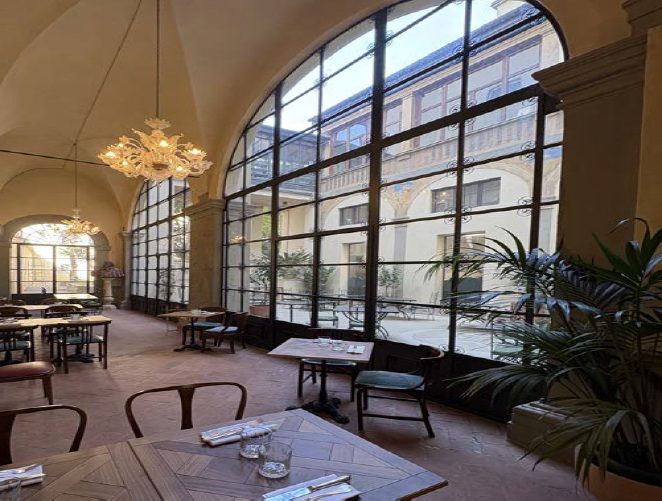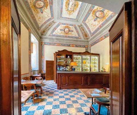 Oggi gli ambienti interni ospitano il ristorante enoteca Baldovino, provvisto di una formidabile collezione di vini custodita nelle antiche cantine del seminterrato. E mi piace pensare che esista un filo rosso che lega questo luogo, dedicato alla buona tavola, a quel Porcone de’ Cancellieri, che fu capostipite della nobile famiglia pistoiese, il cui stemma è ancora ben visibile da chiunque passi di fronte a questo grandioso palazzo.
