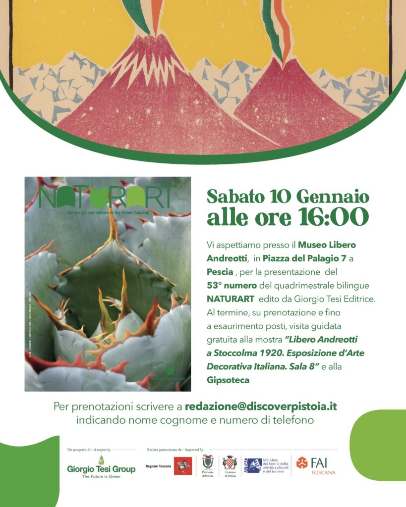 Sabato 10 gennaio alle ore 16.00, il Museo Libero Andreotti di Pescia (Piazza del Palagio 7) ospita la presentazione ufficiale del 53° numero di NATURART, il quadrimestrale bilingue dedicato alla cultura, all’arte e al territorio, edito da Giorgio Tesi Editrice.