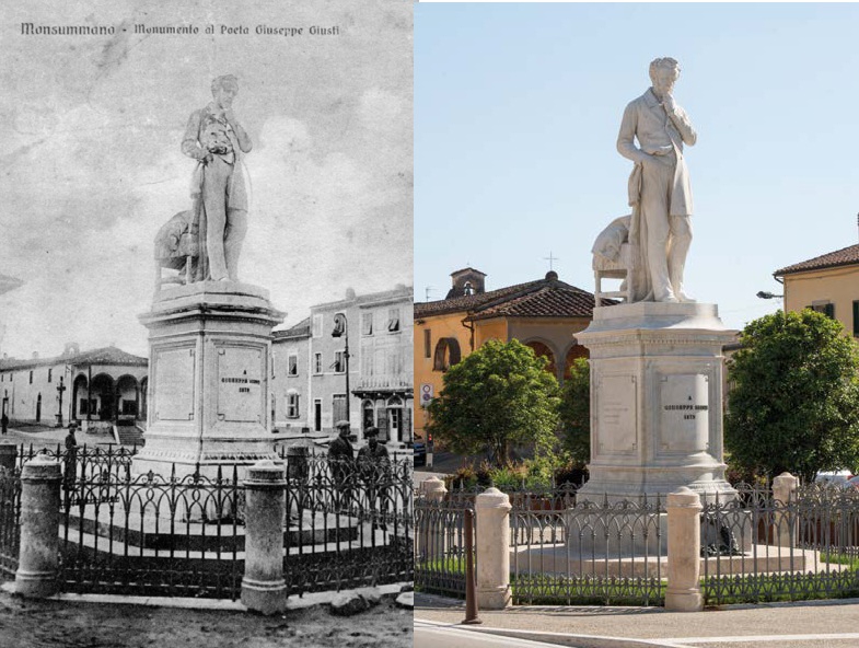 Il restyling di Piazza Giusti a Monsummano Terme, progettato da Karin Chambery e finanziato con i fondi del Piano nazionale di ripresa e resilienza, ha conferito nuova dignità al monumento al poeta Giuseppe Giusti, che si pone lungo l’asse prospettico, finalmente libero da ingombri visivi, che collega la via Francesca al santuario della Fontenuova. Determinante è stata la rimozione della palma, che occultava parzialmente la visuale del monumento e del santuario, oltre ad imporsi come nota dissonante nel contesto urbano. Il monumento a Giusti è stato non solo ripulito, ma anche consolidato laddove si erano verificati fenomeni di corrosione e disgregazione, dovuti alla secolare esposizione agli agenti atmosferici. Il monumento era stato già restaurato nel 1986 da Alberto Casciani, che aveva espresso un orientamento diverso nella scelta di mantenere un velo di patina, piuttosto che riportare il marmo al suo candore originale. Di segno opposto è il nuovo restauro, eseguito da Chiara Martinelli e Sara Guarducci, che hanno optato per il ripristino dello stato originale rimovendo ogni traccia di polveri e smog, secondo l’orientamento oggi prevalente. Anche gli elementi in bronzo, in particolare la corona d’alloro poggiata sul basamento, hanno ritrovato la luminosità originale, grazie all’intervento di restauro effettuato da Nicola Salvioli.